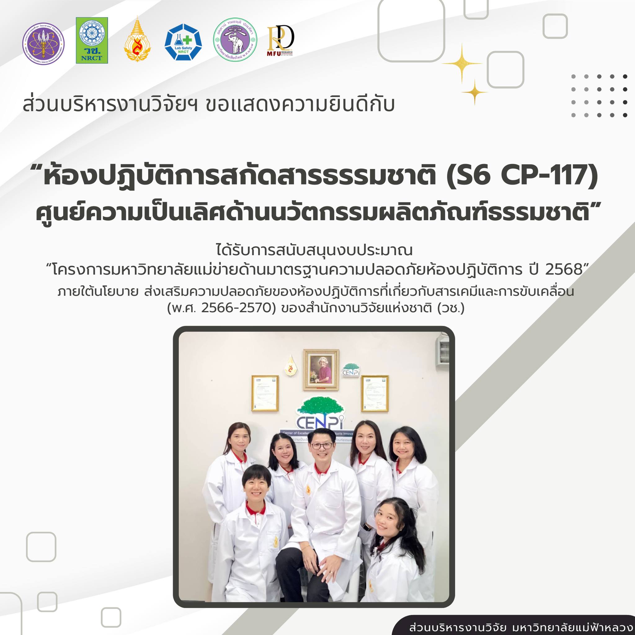 โครงการธำรงรักษาและยกระดับมาตรฐานความปลอดภัยห้องปฏิบัติการ (ห้องปฏิบัติการสกัดสารธรรมชาติ CP 117 ศูนย์ความเป็นเลิศด้านนวัตกรรมผลิตภัณฑ์ธรรมชาติ) โดยมี ผู้ช่วยศาสตราจารย์ ดร.ณัตฐาวุฒิ ฐิติปราโมทย์ รักษาการแทนหัวหน้าศูนย์ความเป็นเลิศด้านนวัตกรรมผลิตภัณฑ์ธรรมชาติ และ นางสาวจันทร์นิภาพร นิ่มกำเหนิด เป็นผู้ดูแลห้องปฏิบัติการ