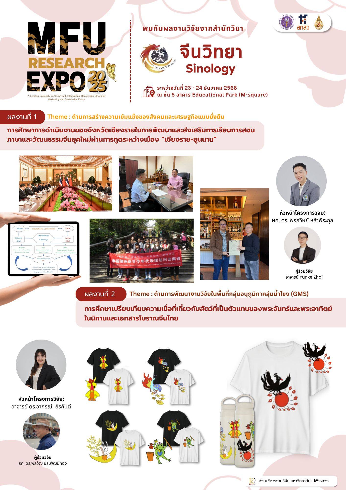 มหาวิทยาลัยแม่ฟ้าหลวง (MFU) เตรียมจัดงาน MFU Research Expo 2025 ระหว่างวันที่ 23–24 ธันวาคม 2568 ณ ชั้น 5 อาคาร Educational Park (M-Square) เพื่อแสดงศักยภาพผลงานวิจัยและนวัตกรรมของมหาวิทยาลัยที่มุ่งยกระดับคุณภาพชีวิต สังคม และสิ่งแวดล้อมอย่างยั่งยืน โดยสำนักวิชาจีนวิทยานำเสนอผลงานวิจัยเด่น 2 โครงการ ที่เสริมสร้างองค์ความรู้ใหม่และเชื่อมโยงความร่วมมือไทย–จีนในด้านสังคม วัฒนธรรม เศรษฐกิจ และ GMS