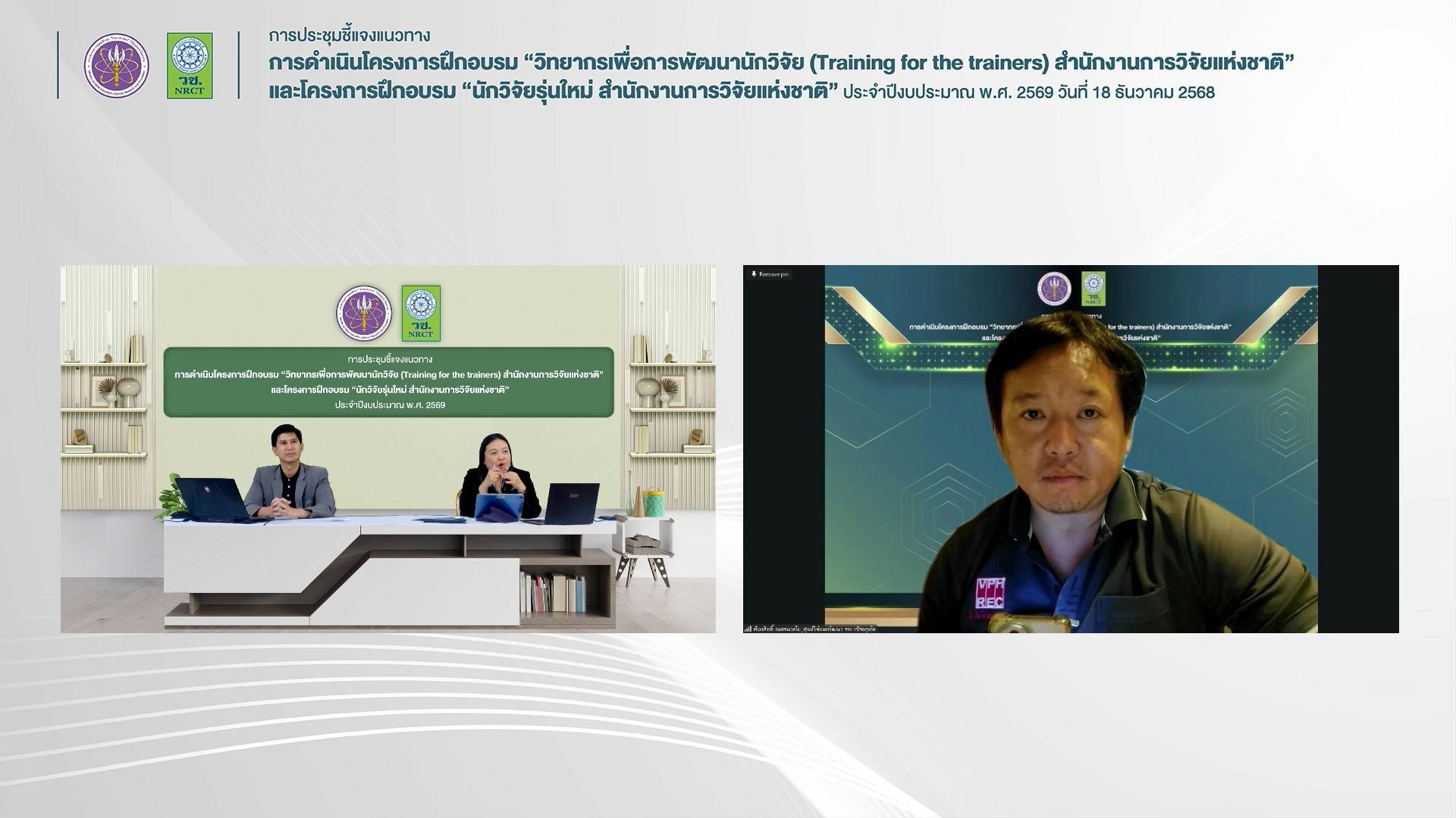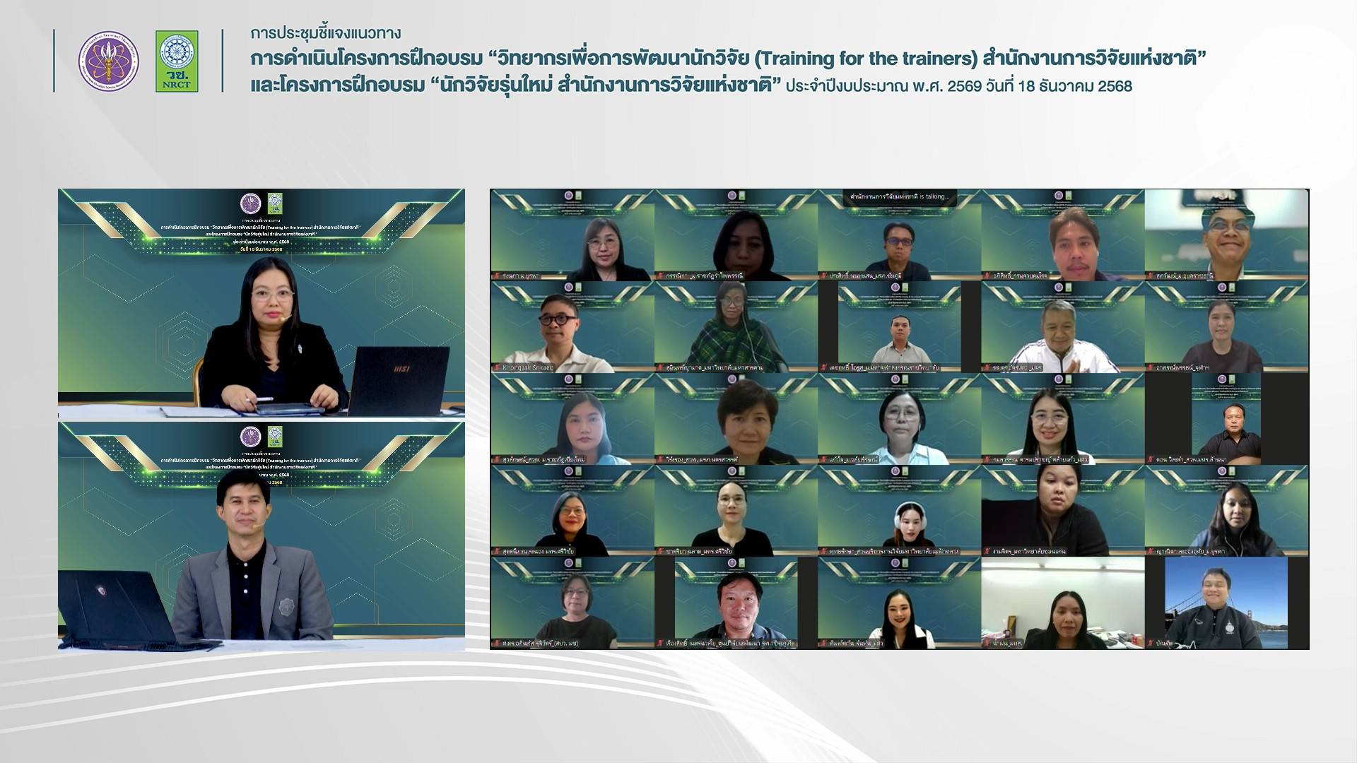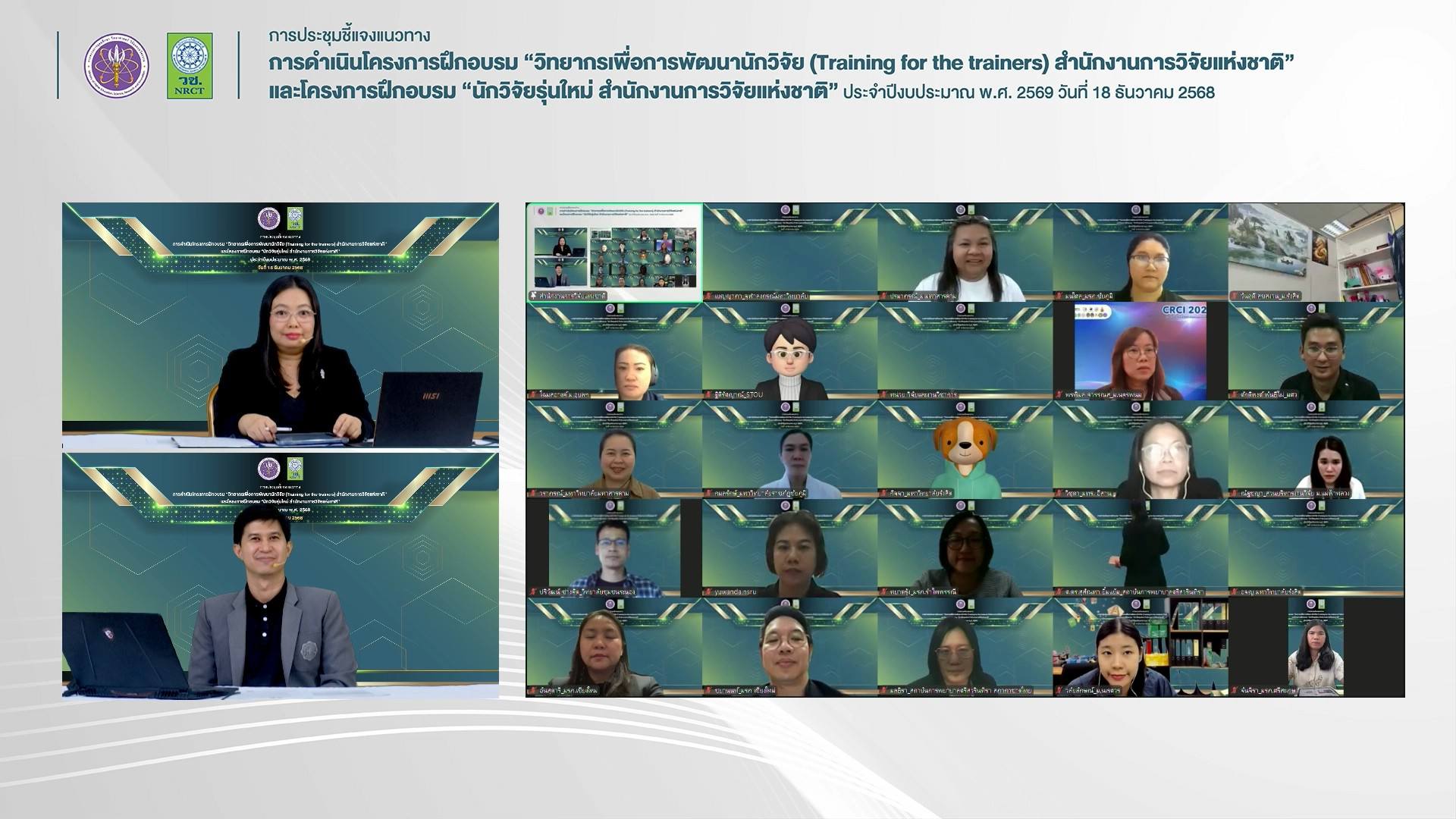 ชี้แจงแนวทางการดำเนินโครงการฝึกอบรม “วิทยากรเพื่อการพัฒนานักวิจัย (Training for the trainers) สำนักงานการวิจัยแห่งชาติ” และโครงการฝึกอบรม “นักวิจัยรุ่นใหม่ สำนักงานการวิจัยแห่งชาติ” ประจำปีงบประมาณ พ.ศ. 2569 ผ่านระบบประชุมทางไกลผ่านจอภาพ (Video Conference) เมื่อวันพฤหัสบดีที่