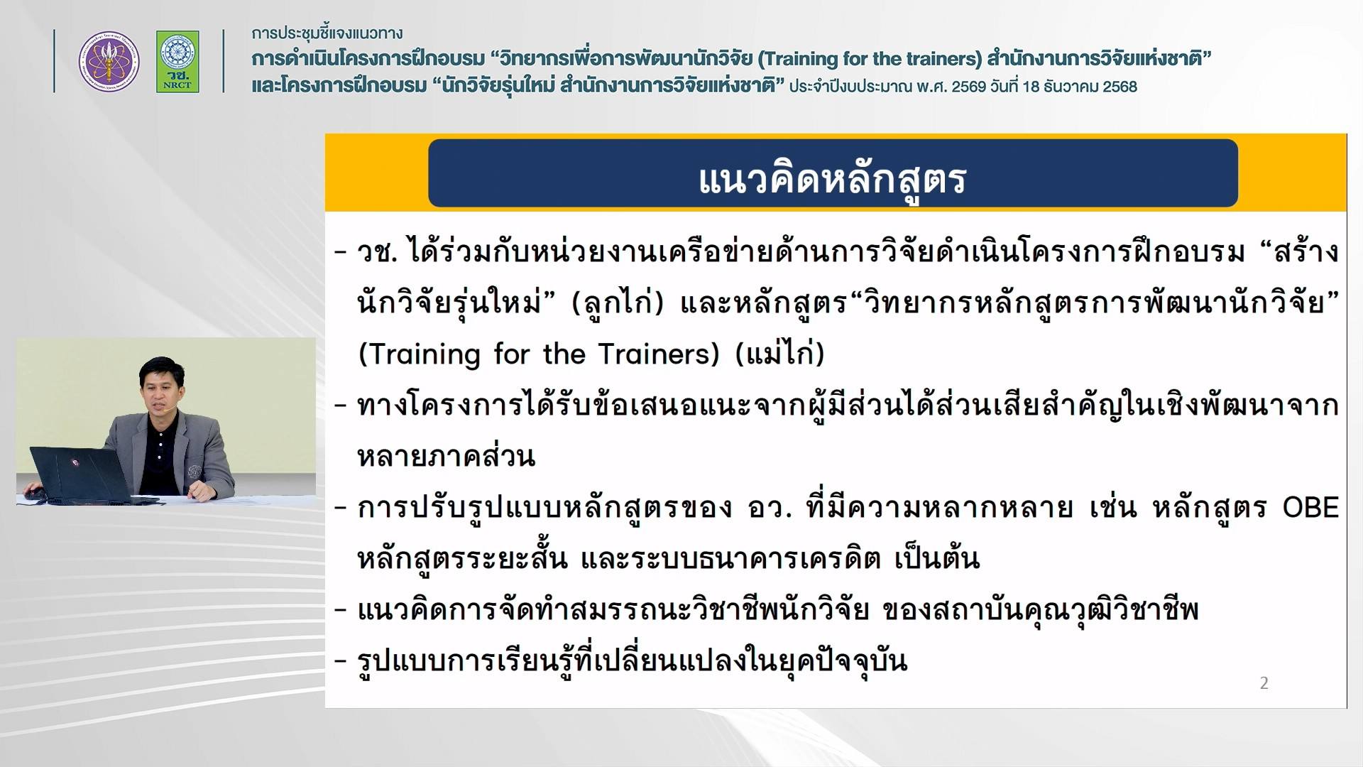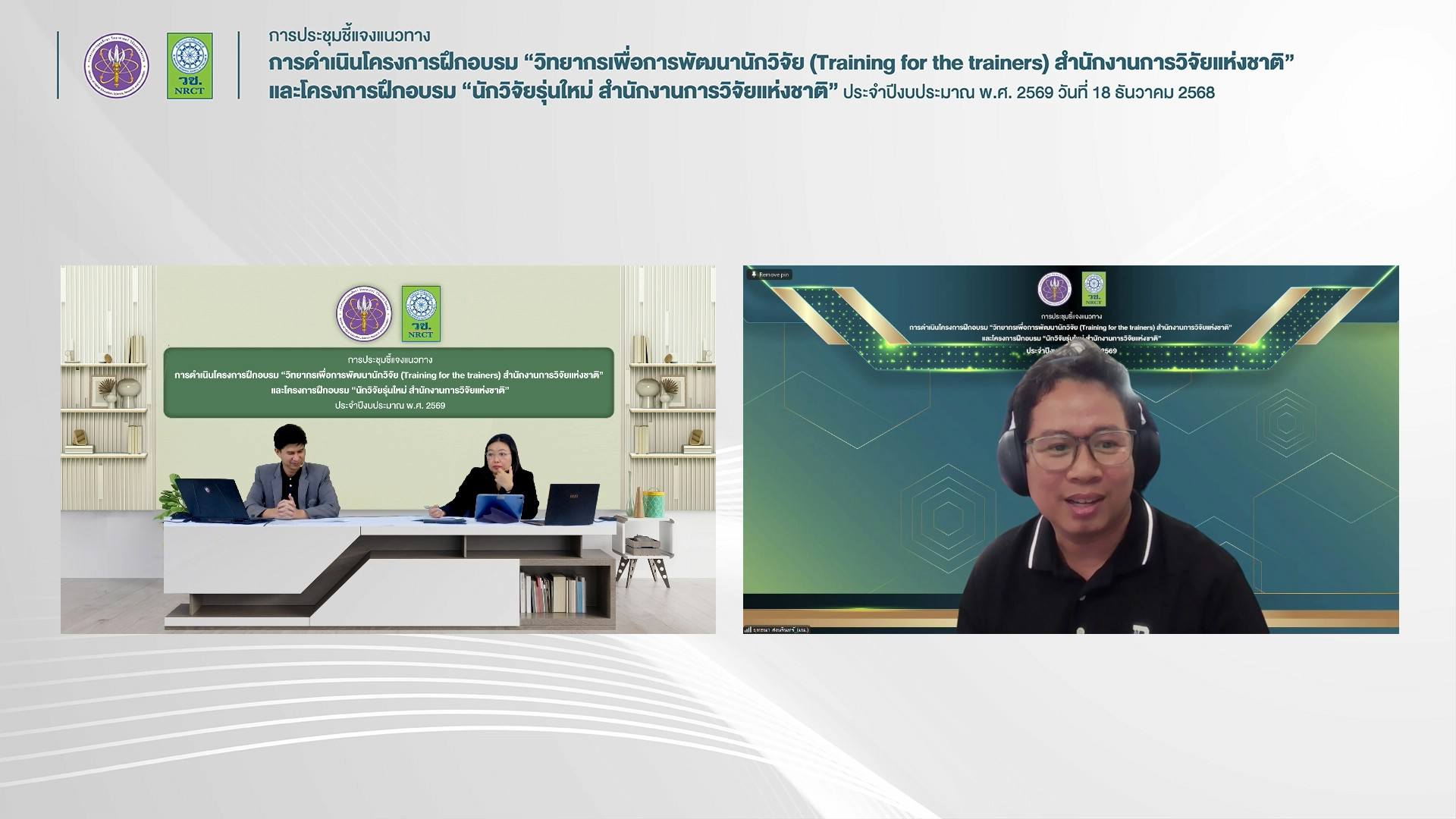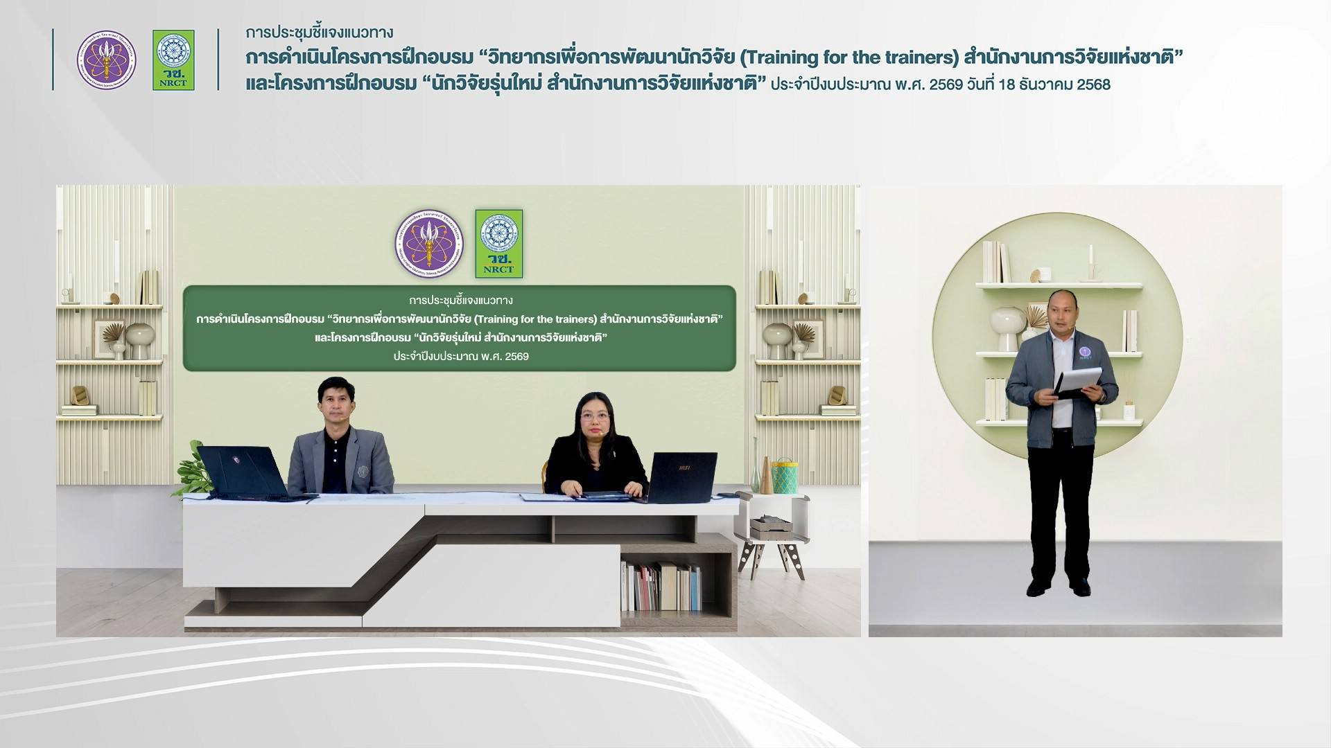ชี้แจงแนวทางการดำเนินโครงการฝึกอบรม “วิทยากรเพื่อการพัฒนานักวิจัย (Training for the trainers) สำนักงานการวิจัยแห่งชาติ” และโครงการฝึกอบรม “นักวิจัยรุ่นใหม่ สำนักงานการวิจัยแห่งชาติ” ประจำปีงบประมาณ พ.ศ. 2569 ผ่านระบบประชุมทางไกลผ่านจอภาพ (Video Conference) เมื่อวันพฤหัสบดีที่