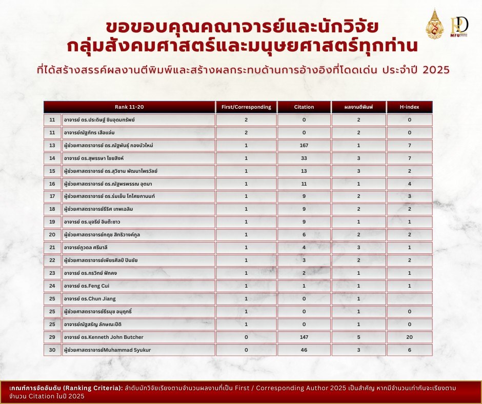 ส่วนบริหารงานวิจัย ขอแสดงความขอบคุณและชื่นชมคณาจารย์ รวมถึงนักวิจัยใน กลุ่มสาขาวิชาสังคมศาสตร์และมนุษยศาสตร์ทุกท่าน ที่ร่วมกันตอกย้ำความสำเร็จผ่านการสร้างสรรค์ผลงานวิจัยอย่างต่อเนื่อง ซึ่งเป็นแรงขับเคลื่อนสำคัญที่ทำให้ภาพรวมผลงานวิจัยของมหาวิทยาลัยแม่ฟ้าหลวงในฐานข้อมูล SCOPUS ประจำปี 2025 พุ่งสูงถึง 575 ผลงาน สร้างสถิติใหม่ (New High) ให้กับมหาวิทยาลัยอย่างน่าภาคภูมิใจ
