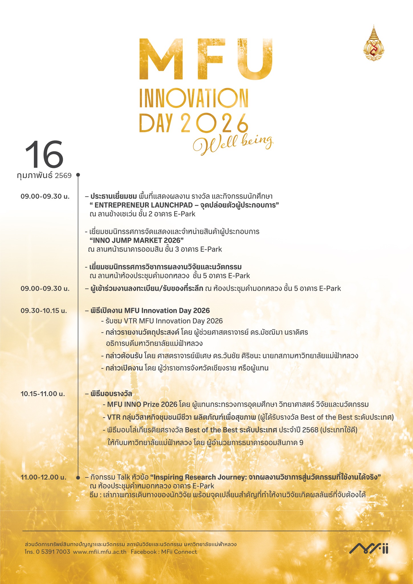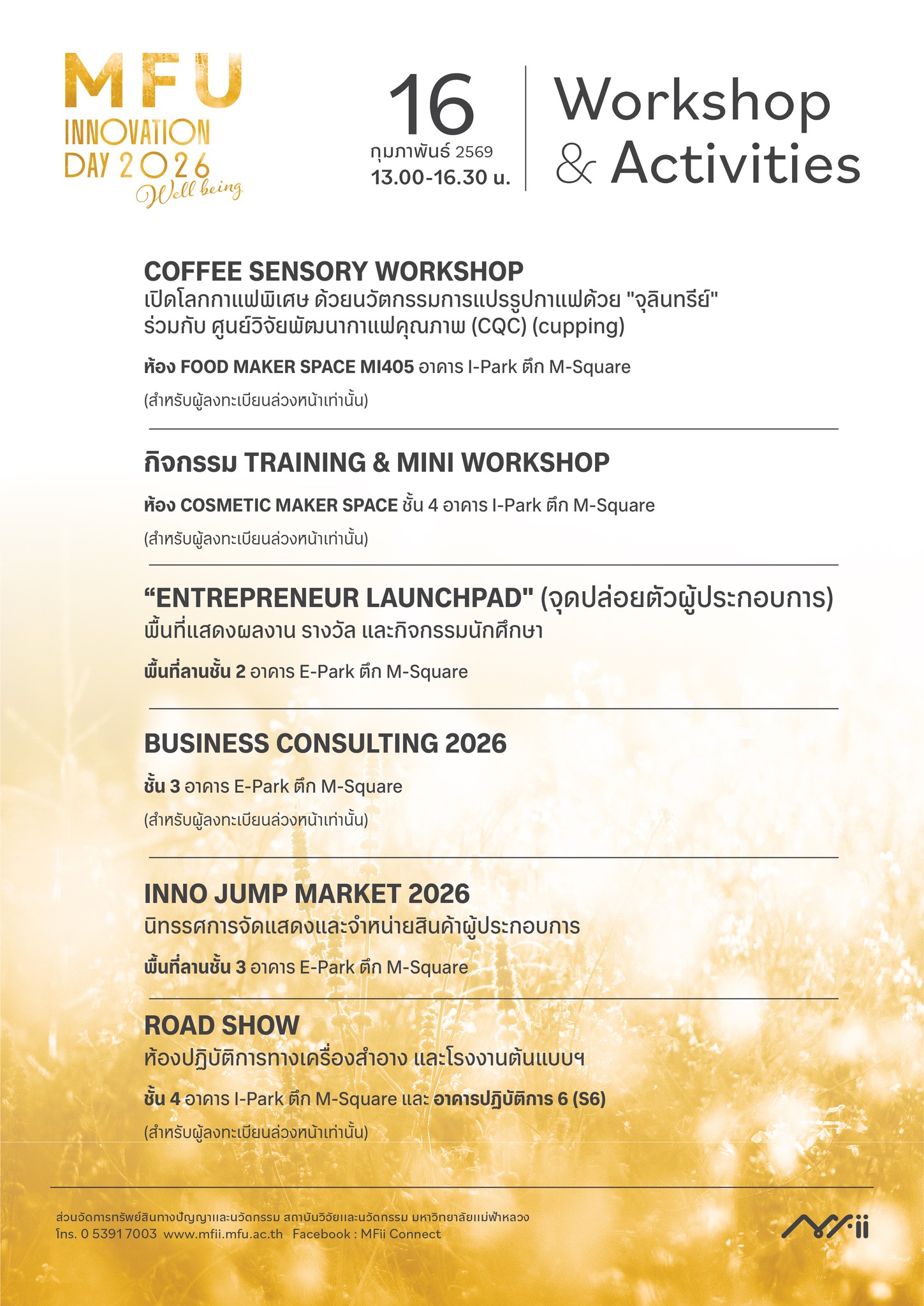 ลงทะเบียนเข้าร่วมกิจกรรม https://bit.ly/mfu-innovationday-2026