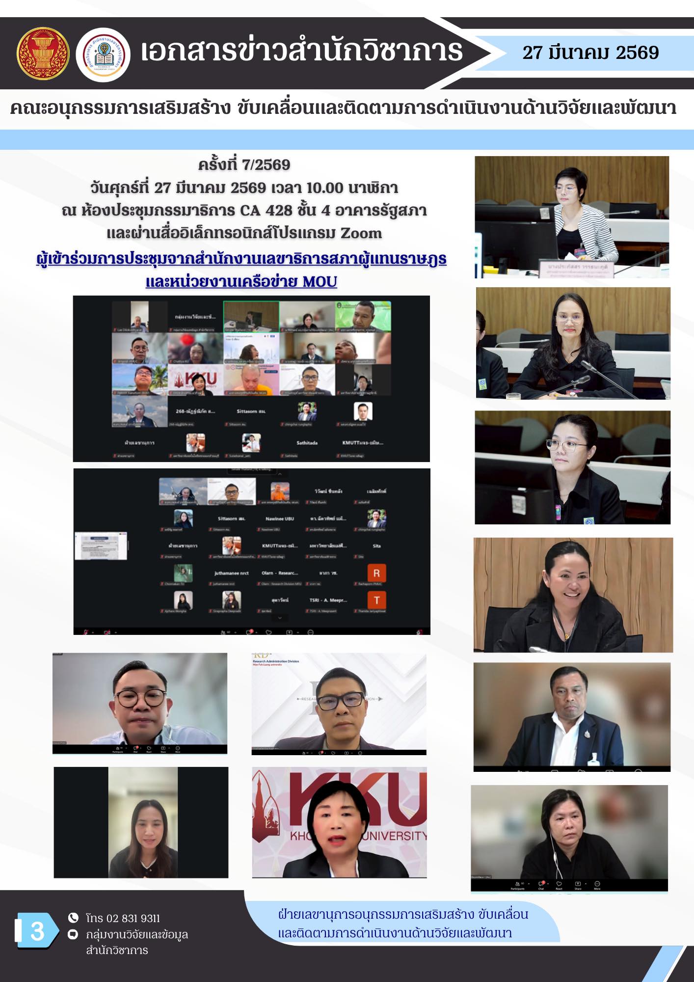 วันศุกร์ที่ 27 มีนาคม 2569 เวลา 10.00 นาฬิกา คณะอนุกรรมการเสริมสร้าง ขับเคลื่อนและติดตามการดำเนินงานด้านวิจัยและพัฒนา ครั้งที่ 7/2569 ได้จัดการประชุม ณ ห้องประชุมกรรมาธิการ CA 428 ชั้น 4 อาคารรัฐสภา และผ่านสื่ออิเล็กทรอนิกส์โปรแกรม Zoom โดยมี นายชิบ จิตนิยม สมาชิกวุฒิสภา ในฐานะประธานคณะอนุกรรมการฯ เป็นประธานในการประชุม